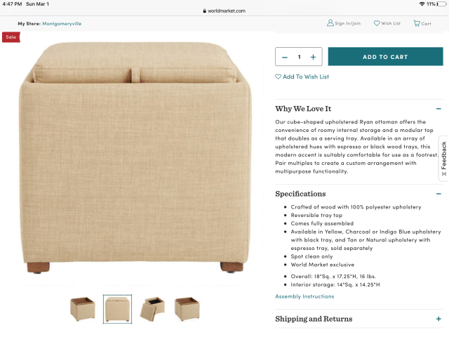 Thus began my search for the perfect cocktail table. I wanted to choose something that rounded out the space, and where we’d be able to put our feet up. Of course it’s always nice to have a place for resting a book or glass from time to time and storage is always a plus. I won’t bore you with all the candidates I looked at…in the end it came down to size and simplicity. I really wanted something relatively solid and chunky to break up all the legginess going on. That meant a cube ottoman was the perfect thing!