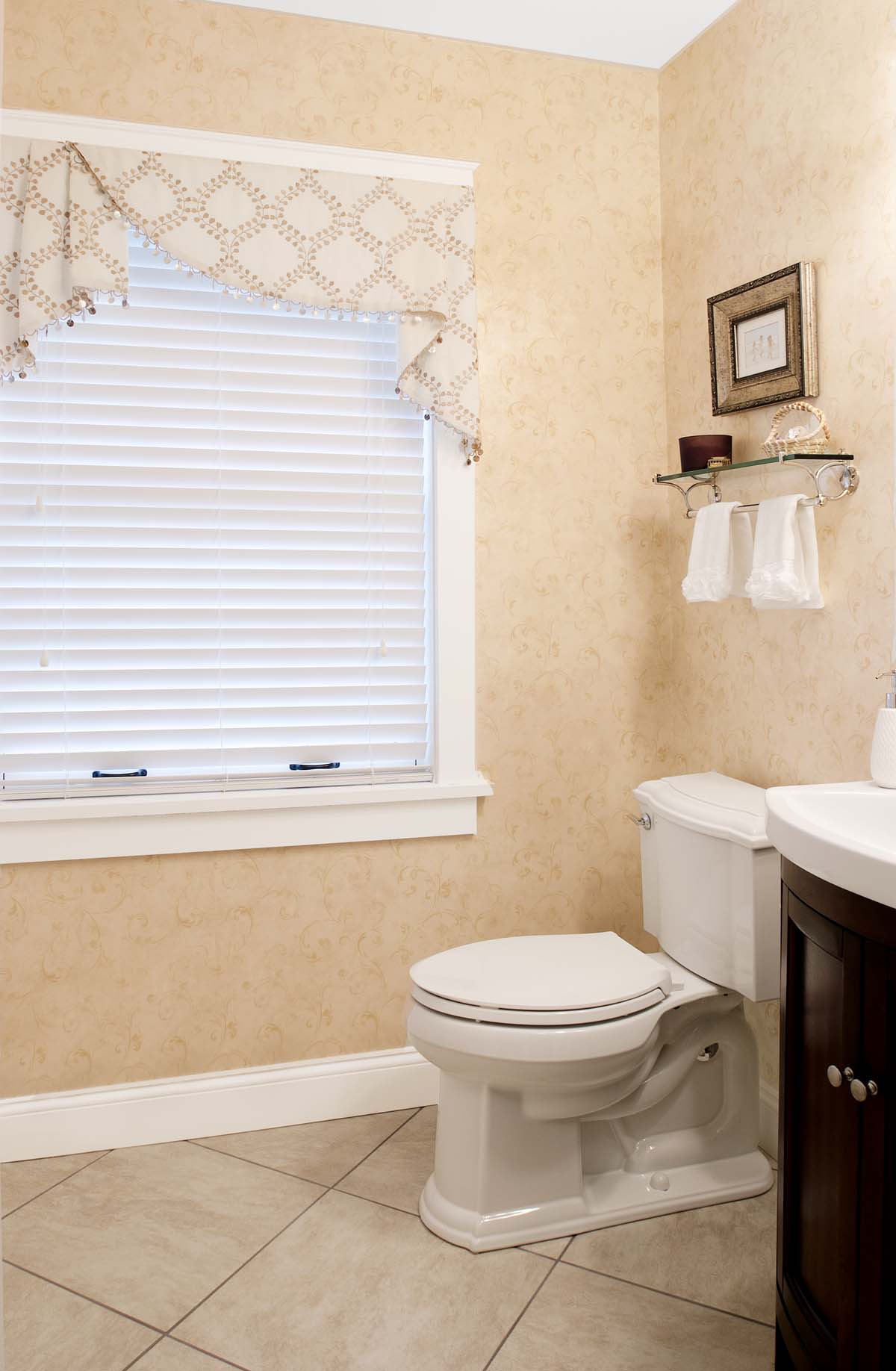 Affordability is another reason to limit its use. Often these amazing wall treatments are quite costly and sold by the foot or even by the yard, like fabric, as opposed to the single roll method we’ve been employing for years. Using expensive paper on just one accent wall allows for the super chic look of a high-end paper, without breaking the client’s budget. Alternately, you might try using an understated paper in a small room, like in this image from my client’s powder room.