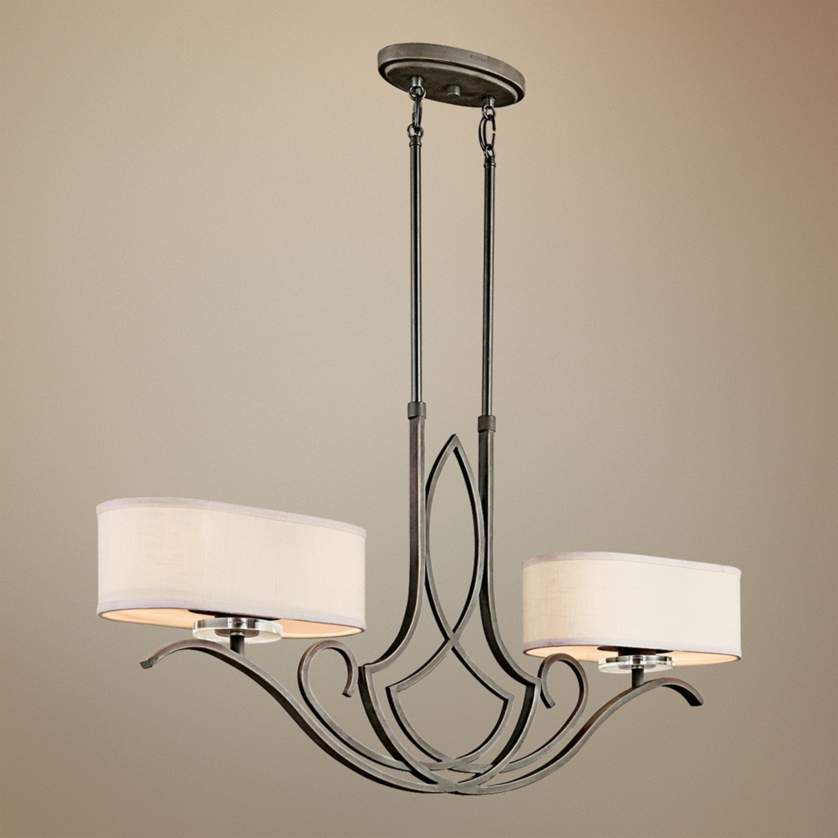 A beautiful chandelier boasts a metal scroll/calligraphy detail with a glass bowl under a linen barrel shade.