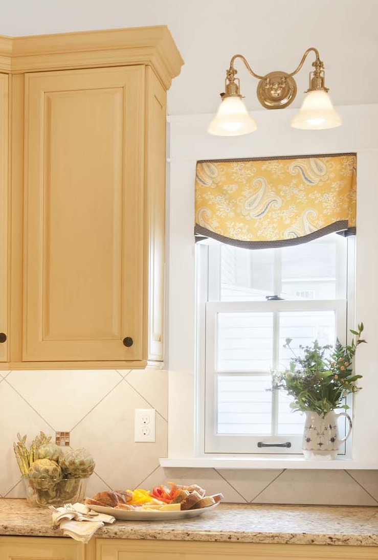 In my client’s kitchen, even the cabinets are finished in a color found directly in the fabric on the adorable pleated valance.