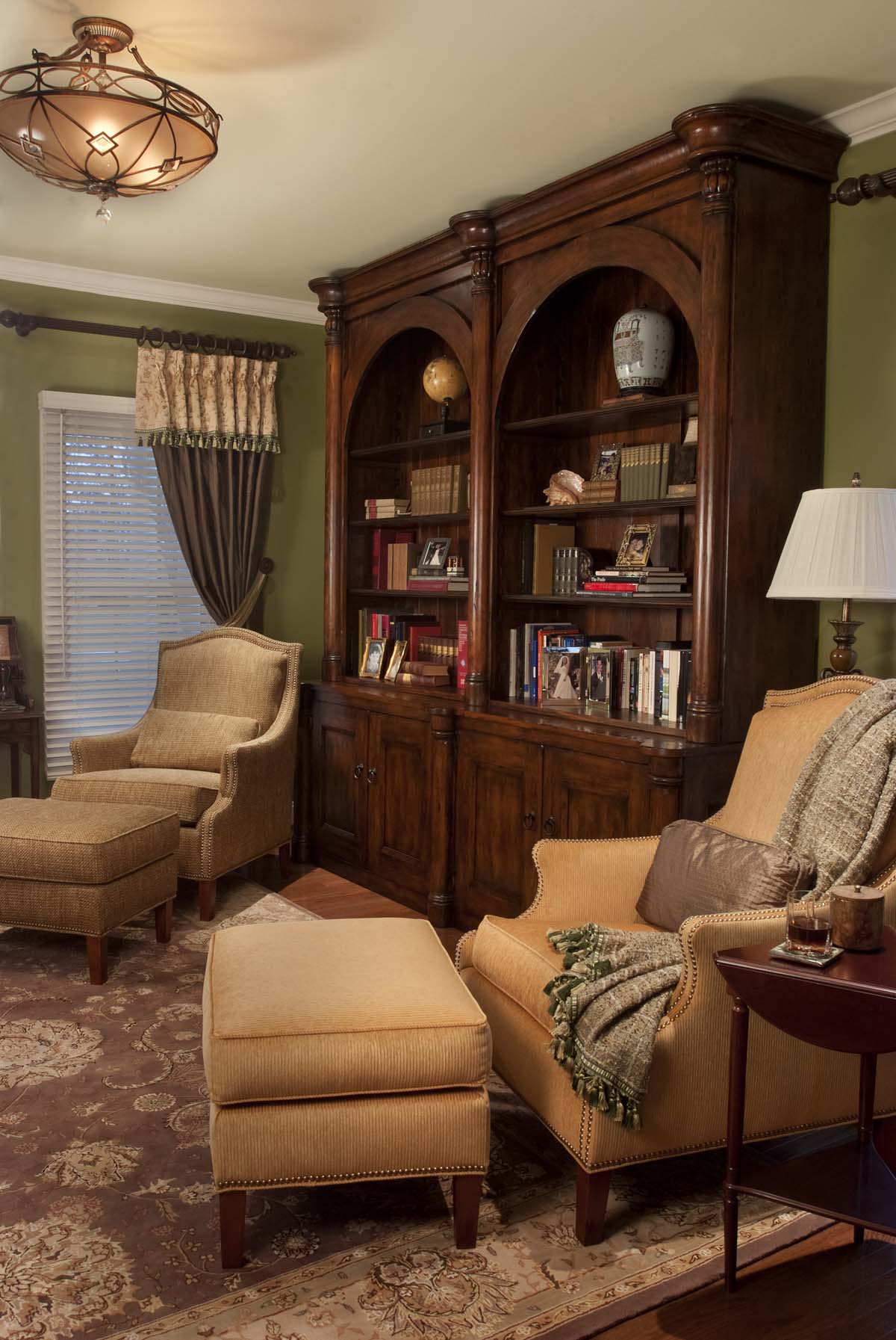 A bold Green wall color was chosen to enhance darker drapery fabric, and the furnishings support the color scheme in green and gold.