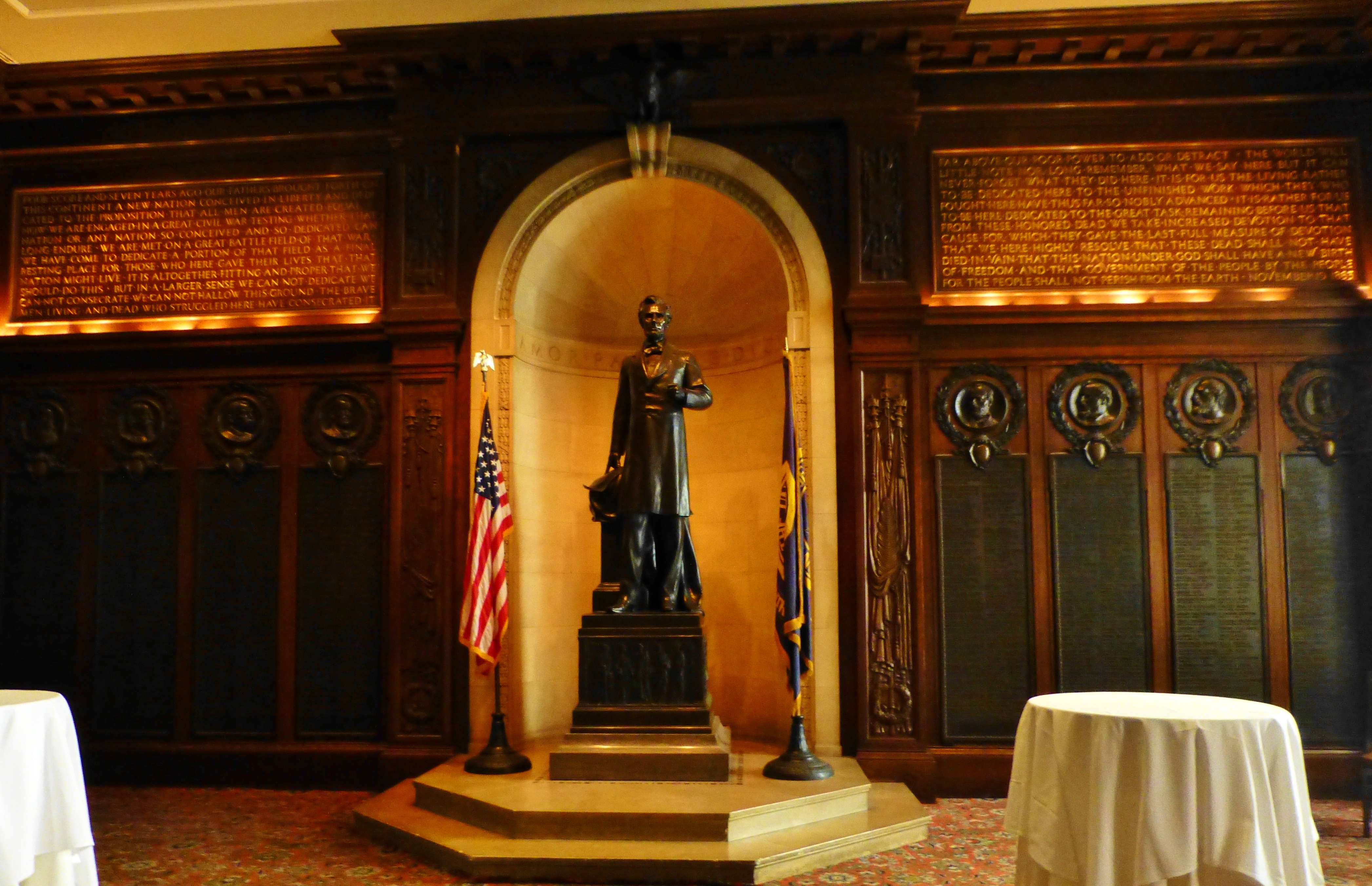 A small dark-paneled library has a statue of Abraham Lincoln and the Gettysburg Address carved into the woodwork and gilded.
