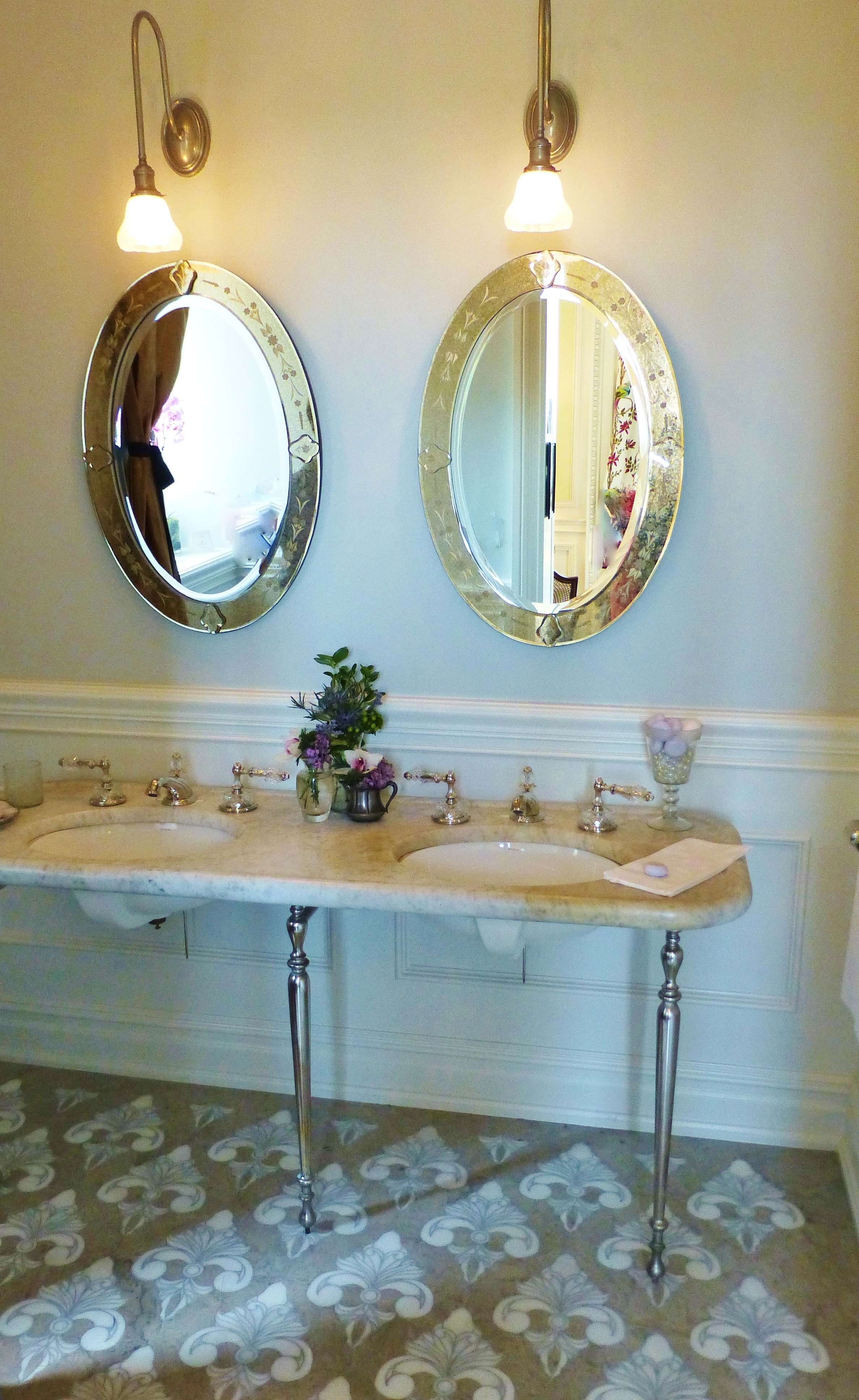 This serene powder room is just outside the office of the lady of the house. The paneling is elegant, the colors are inviting, the lighting sparkles and the accessories are beautiful.
