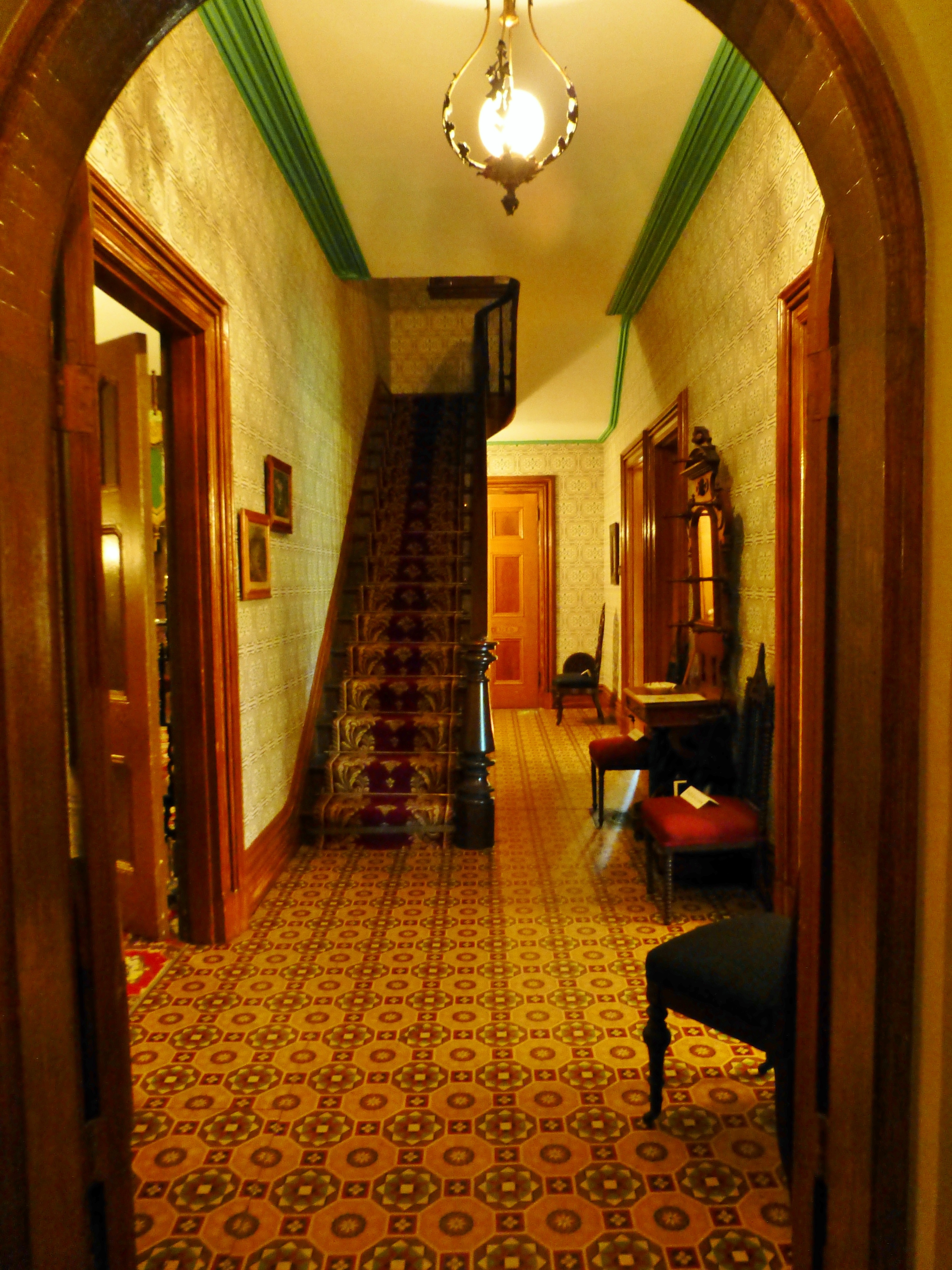 The entry hall of the Ebenezer Maxwell Mansion features true Victorian elements with lots of pattern. Wallpaper is a prominent feature, as is the historically accurate linoleum floor (a Victorian innovation fabricated with Linseed Oil). Also of note is the richly patterned stair runner with brass rods.