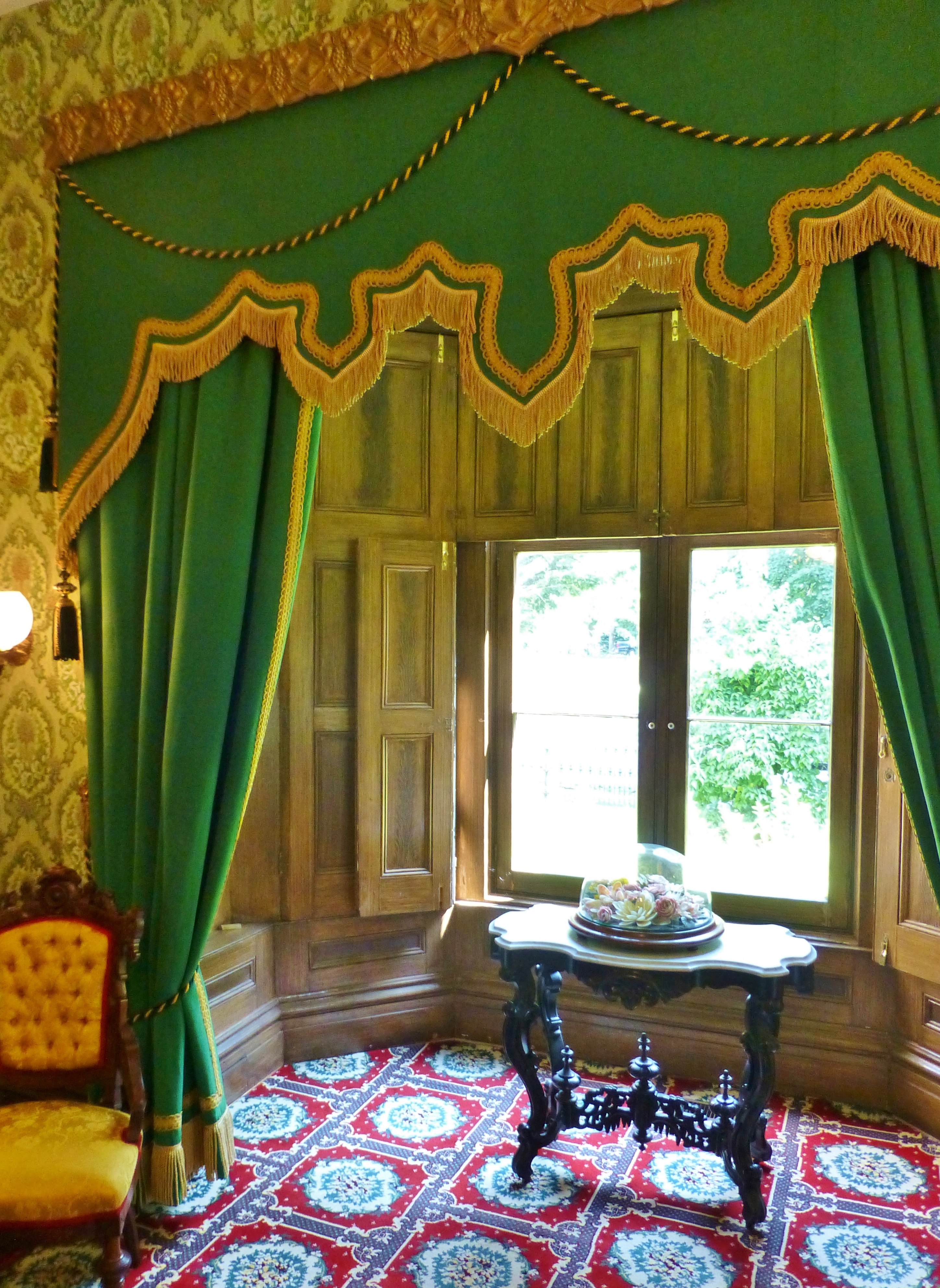 Wow, right?! The Victorians loved layering pattern.  This large floral geometric patterned wall-to-wall carpeting was a popular Victorian flooring choice in the second half of the nineteenth century.  The ornate bold green draperies feature gold bullion fringe and luxurious trimmings.
