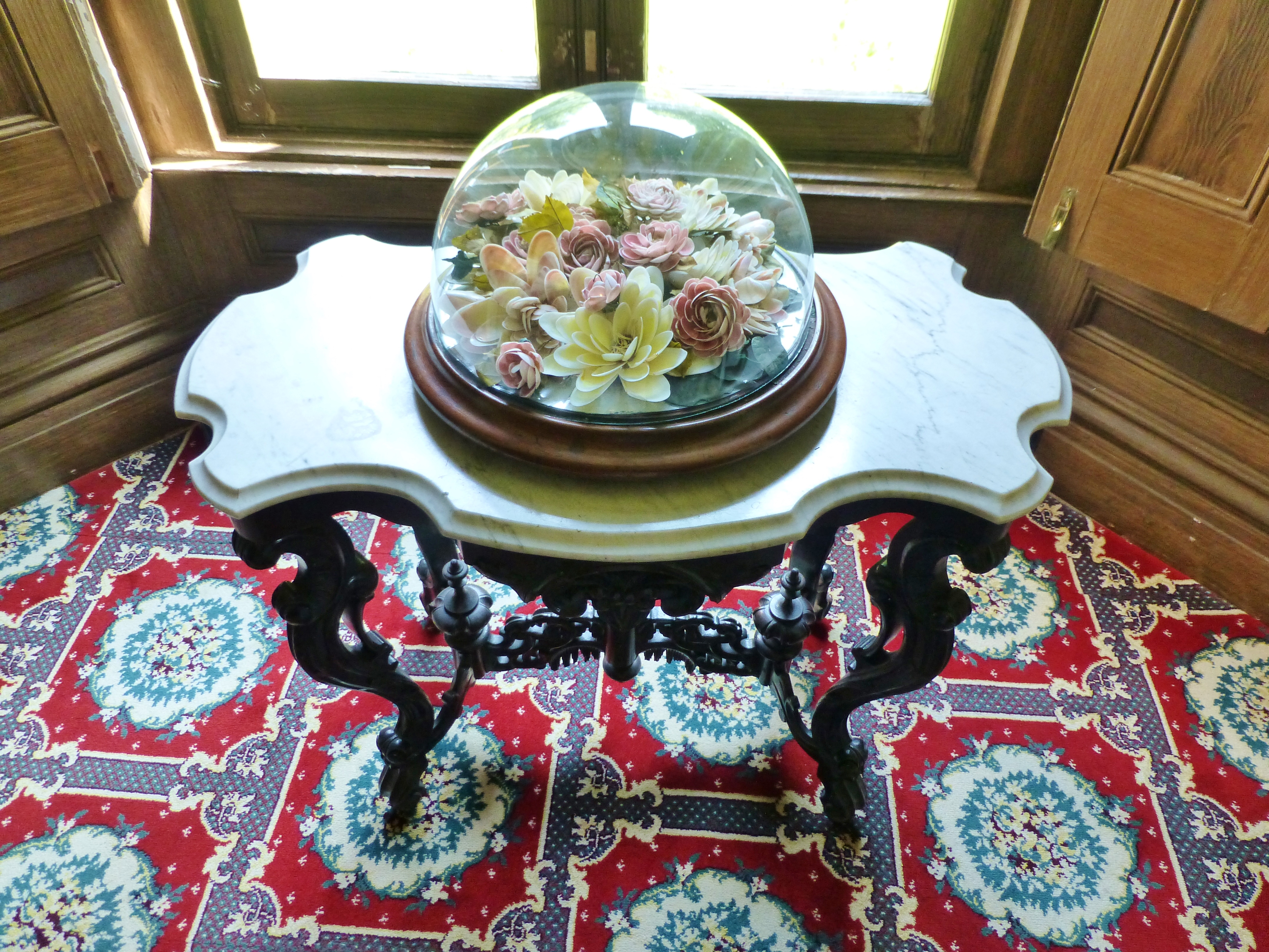 The bay window features an absolutely stunning Rococo Revival style marble-topped table. On top of the marble-topped table is a splendid Victorian Cloche (glass dome) featuring an arrangement of sea shells artfully arranged in the shape of flowers. Isn’t it so beautiful and amazing!”