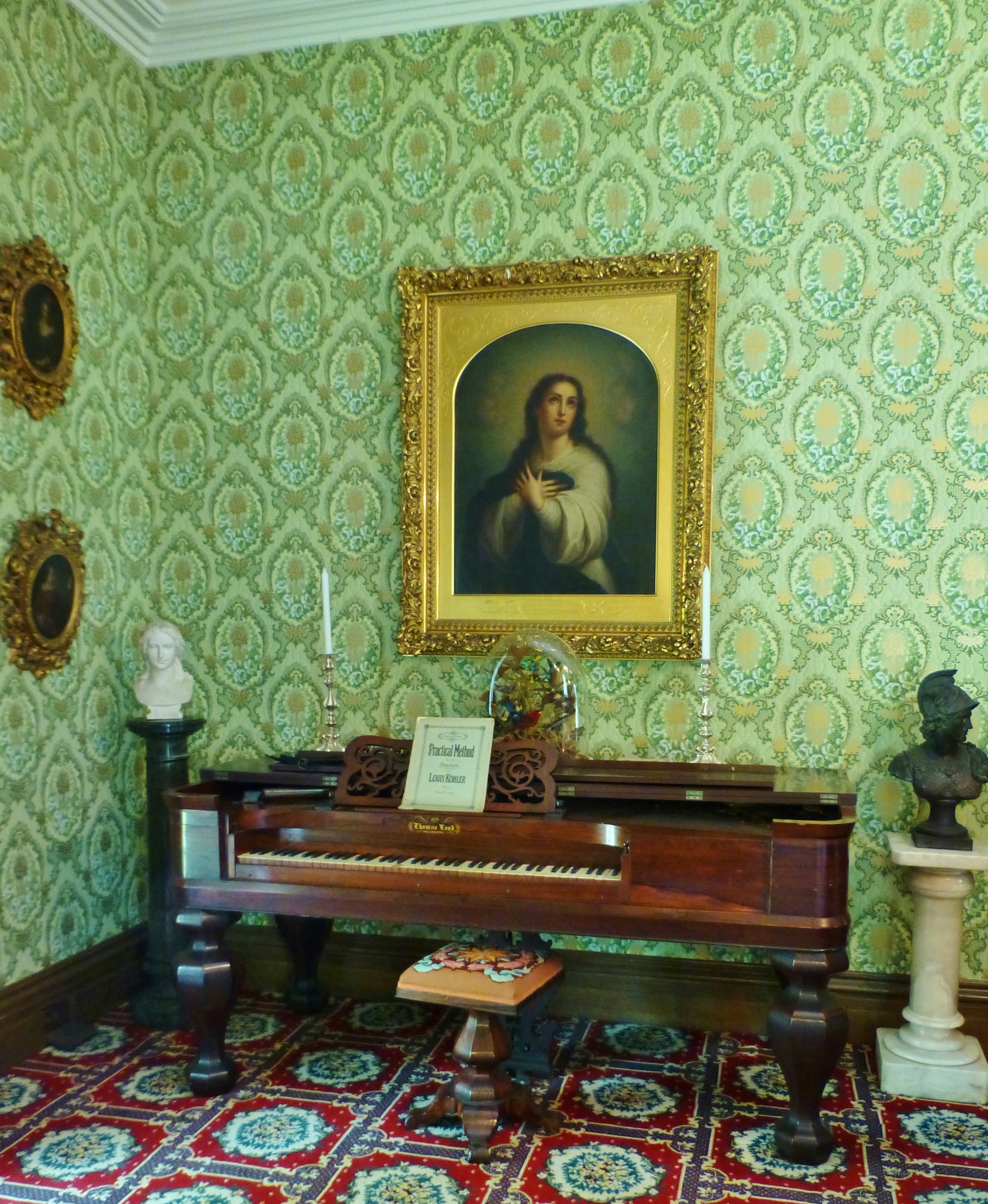 Did you spot this amazing example of Victorian Bird Taxidermy on top of the piano?  The colorful birds are preserved under a glass dome with a marble base.  This too was a popular Victorian interior decoration and is still very collectible today.