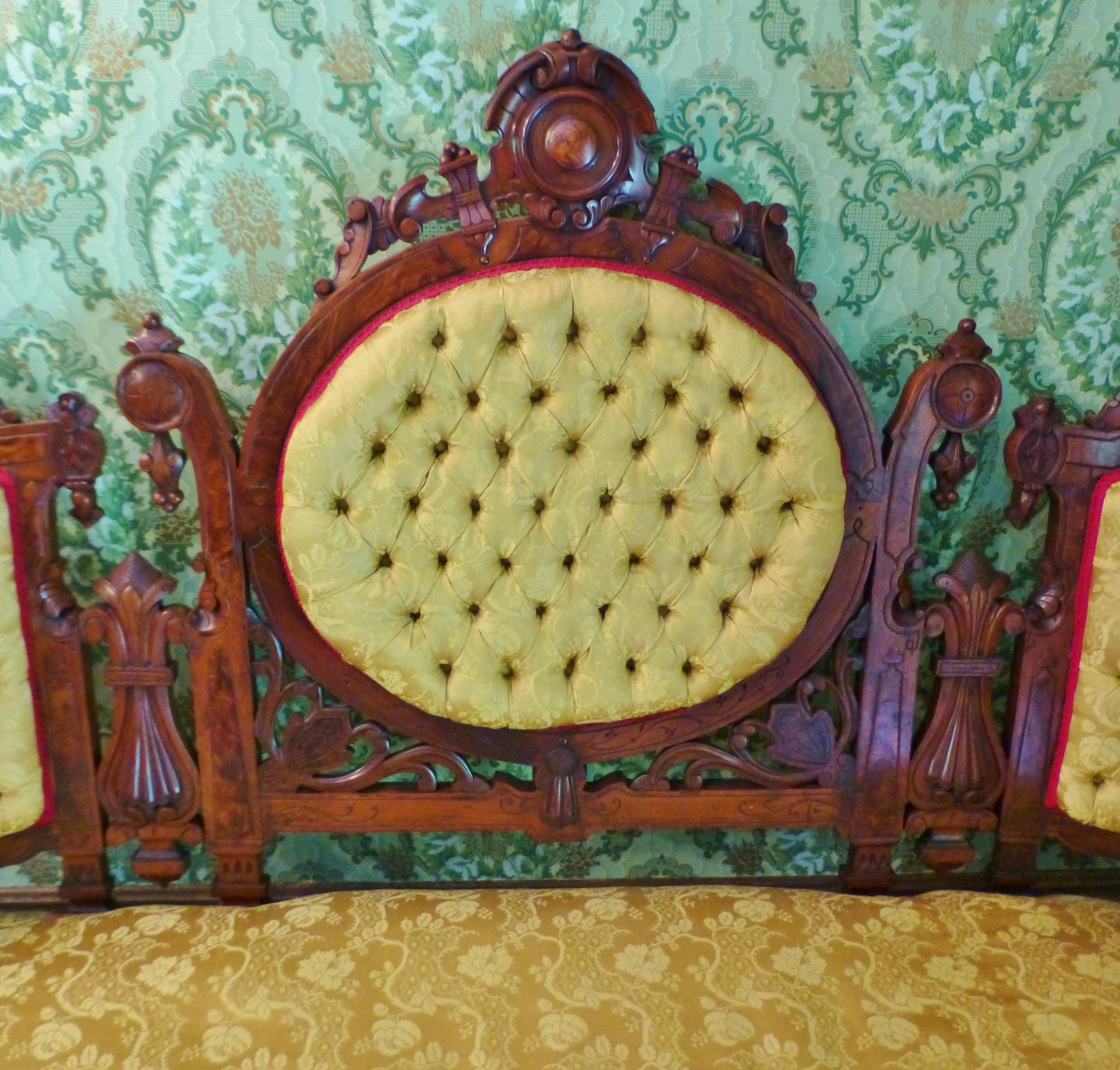 The Renaissance Revival settee in this photo has such amazing carved details and is one of a pair found in the parlor, along with some matching chairs.  These are such sculptural pieces of furniture.  The cheerful yellow upholstery really brightens the dark (but beautiful), heavily carved wood.