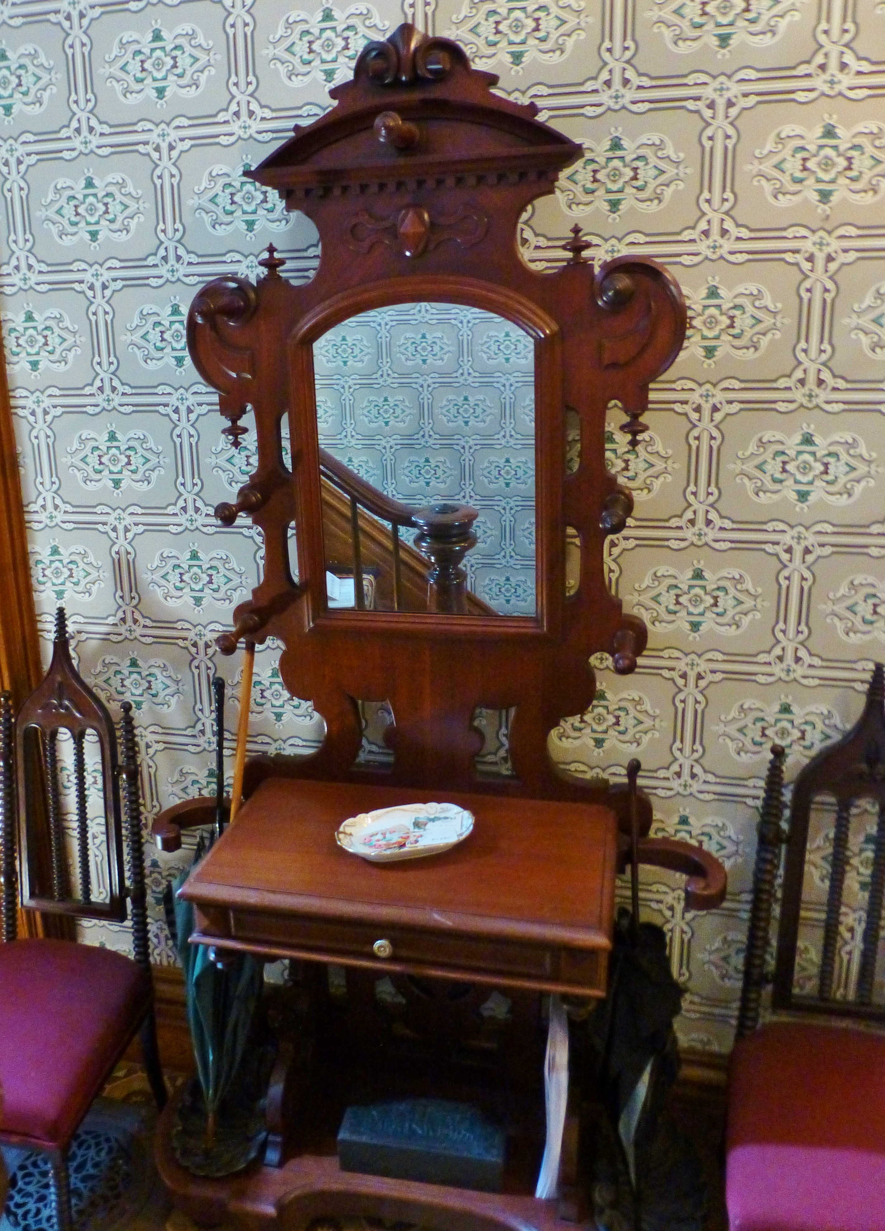 Once inside the spacious foyer, one notices the large ‘Hall Tree’. This is an important piece of furniture in every Victorian Home, since coat closets are a modern idea. This one has much needed coat and hat hooks along with umbrella and cane storage.
