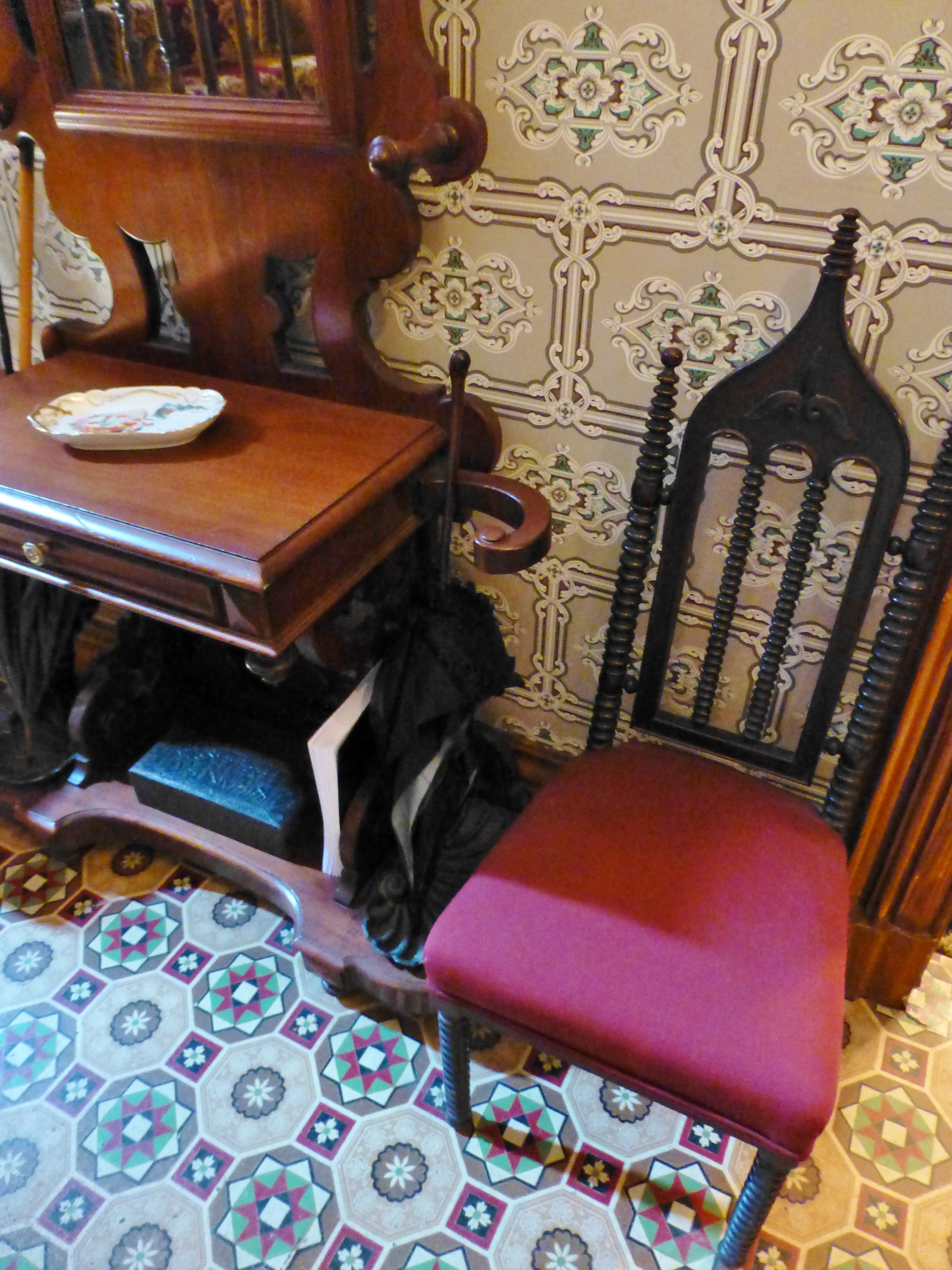 Flanking the Hall Tree are a pair of lovely Victorian Gothic Revival chairs. These are fabulous examples of this quintessentially Victorian furniture. Don’t you just love all the spool turning–so exotic!