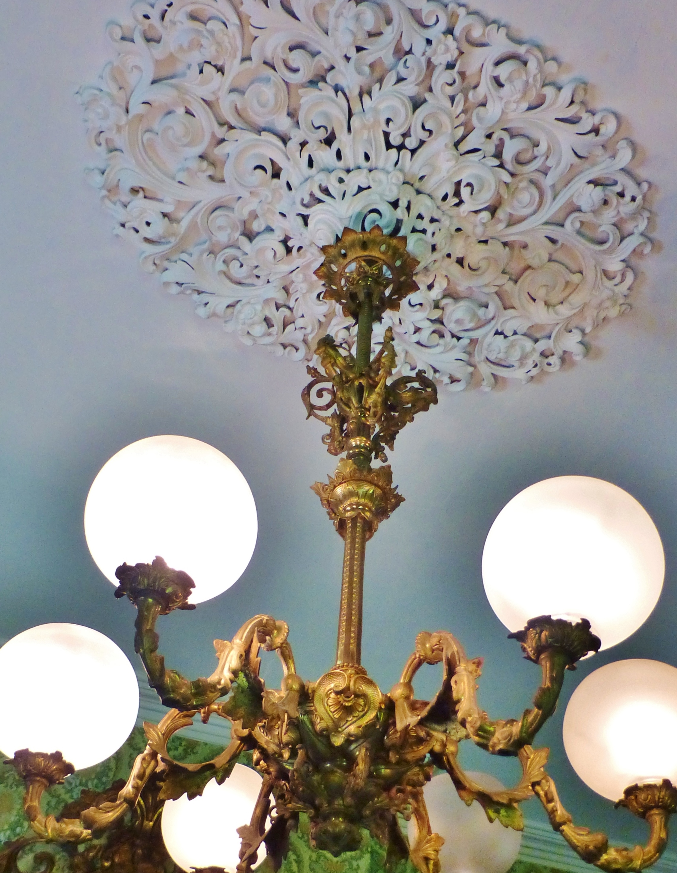 A detail of the opulent chandelier and ceiling medallion in the parlor at the Ebenezer Maxwell Mansion.