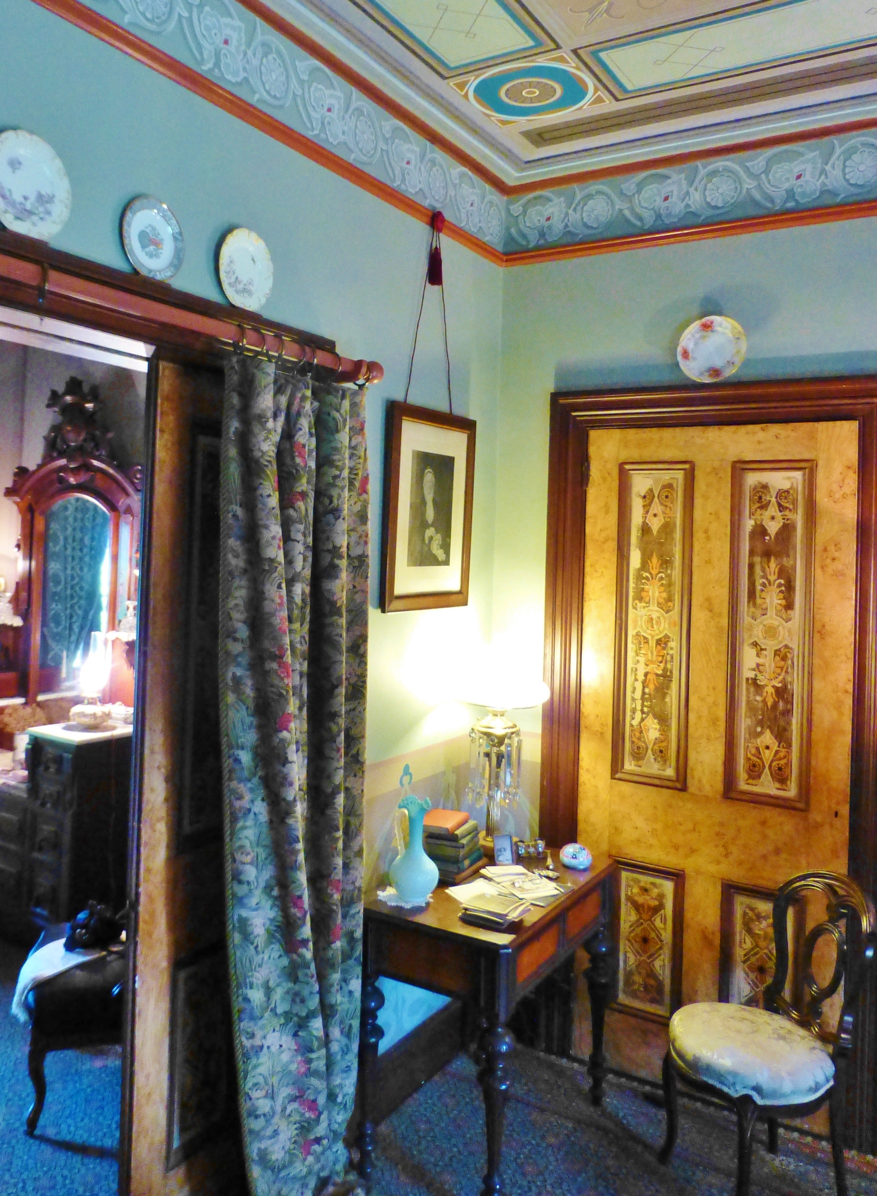 In a corner near the entry to the bedroom, sits a small desk and chair. This photo shows a door with handpainted woodwork featured in the lounge. You’ll also notice the draperies on the pocket door. These are called Portieres and, in addition to being decorative, helped to further divide and provide insulation between the spaces.