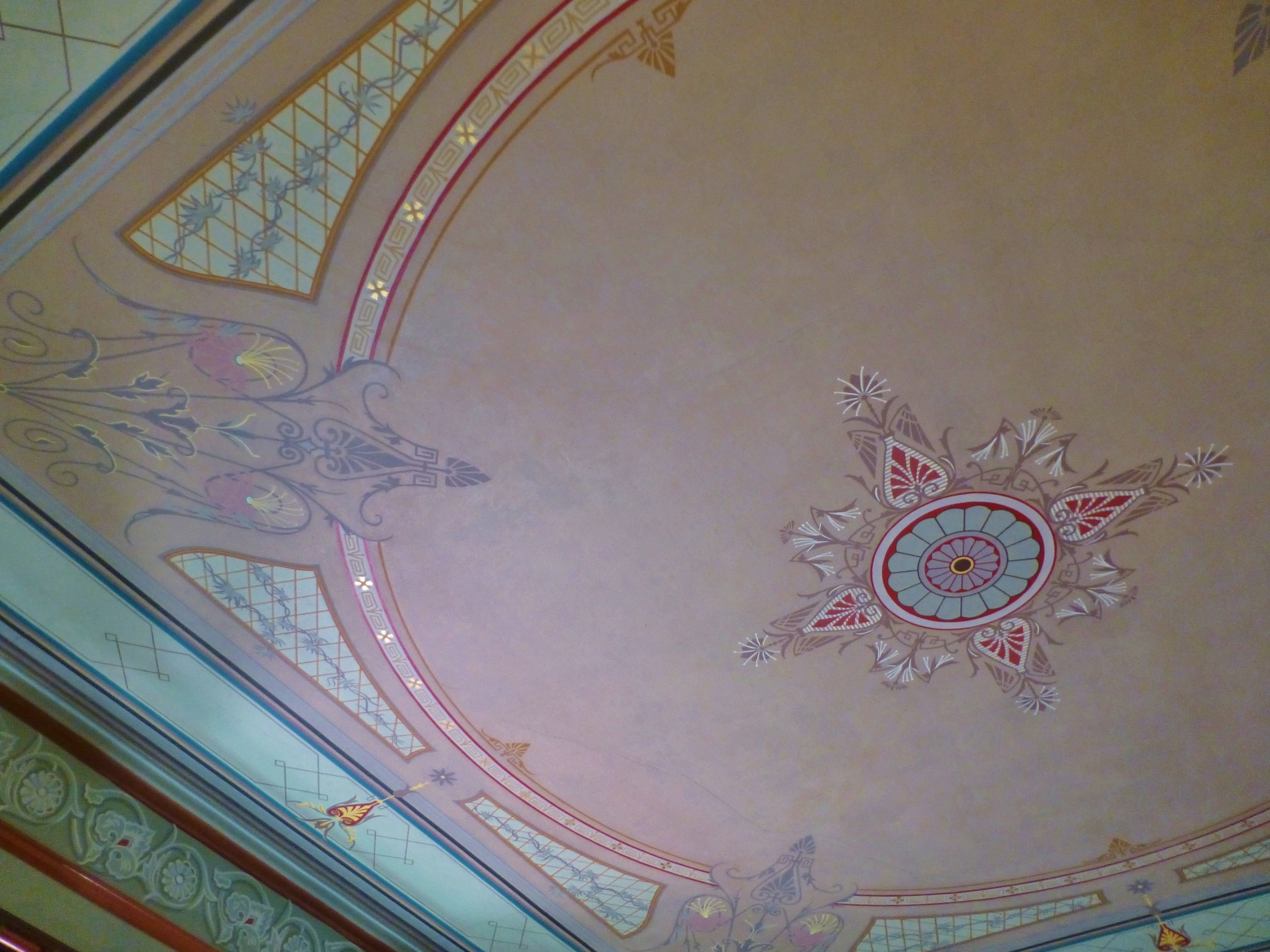 Across the room you’ll notice a red settee behind a small Ebonized table set for tea. In this image you’ll notice the ornately handpainted wainscoting, frieze, and ceiling. The color combinations here are fantastic: lavender, rose, gold, turquoise, and green.