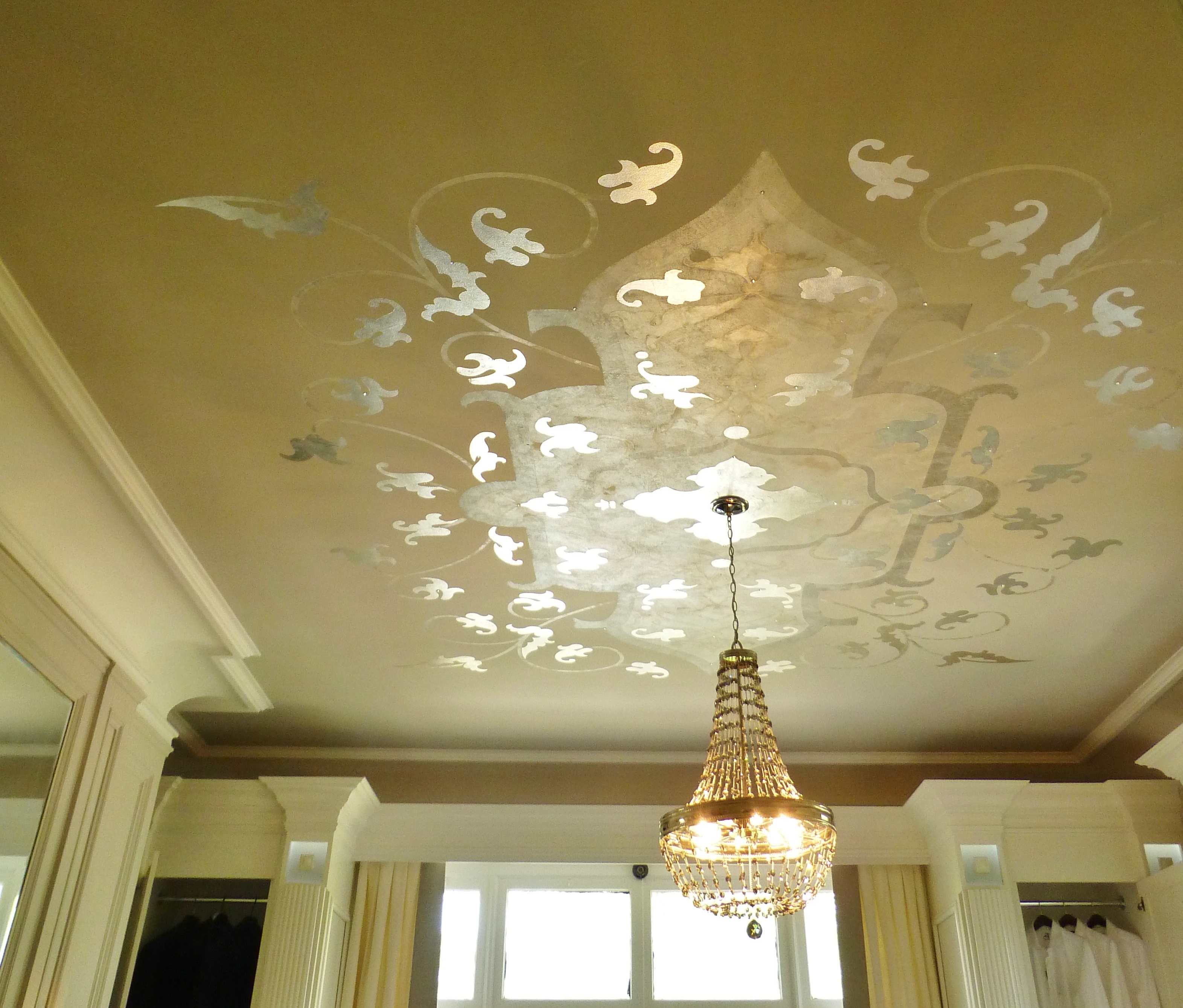The amazing painted ceiling in the formal dressing lounge, features metallic and pearl finishes. It even has sequin embellishments! Can you see the back lit blocks at the top of the cabinets? Fluted pilasters (which offer pull-out storage) are featured at the sides of the cabinet doors, and the back-lit medallions really draw your eye to these architectural details. What a great feature to add interest to the white cabinetry throughout the room.