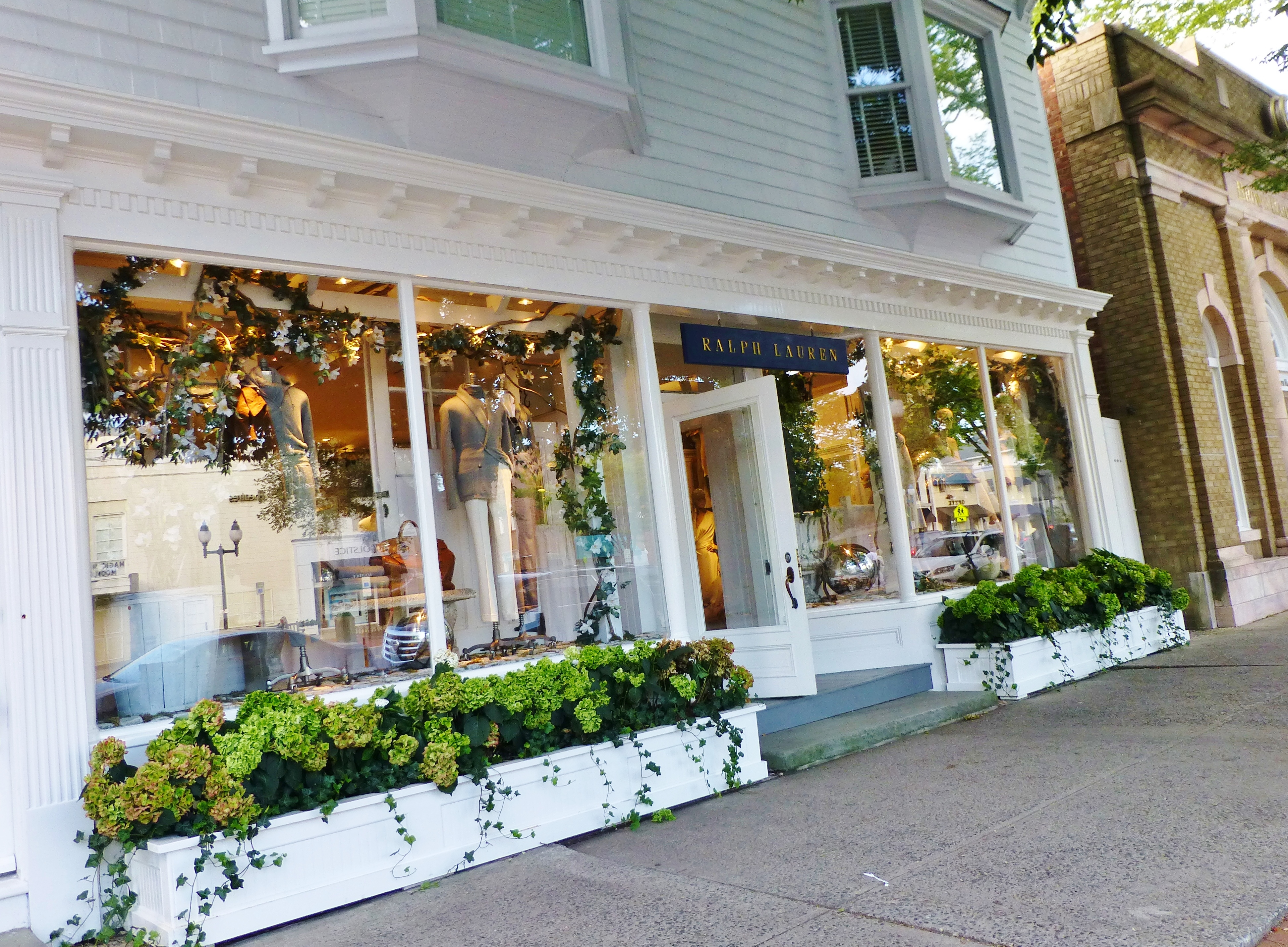 The rear entry of a Ralph Lauren store in the Hamptons. It’s so inviting with trailing greenery and lush plantings of Hydrangeas!