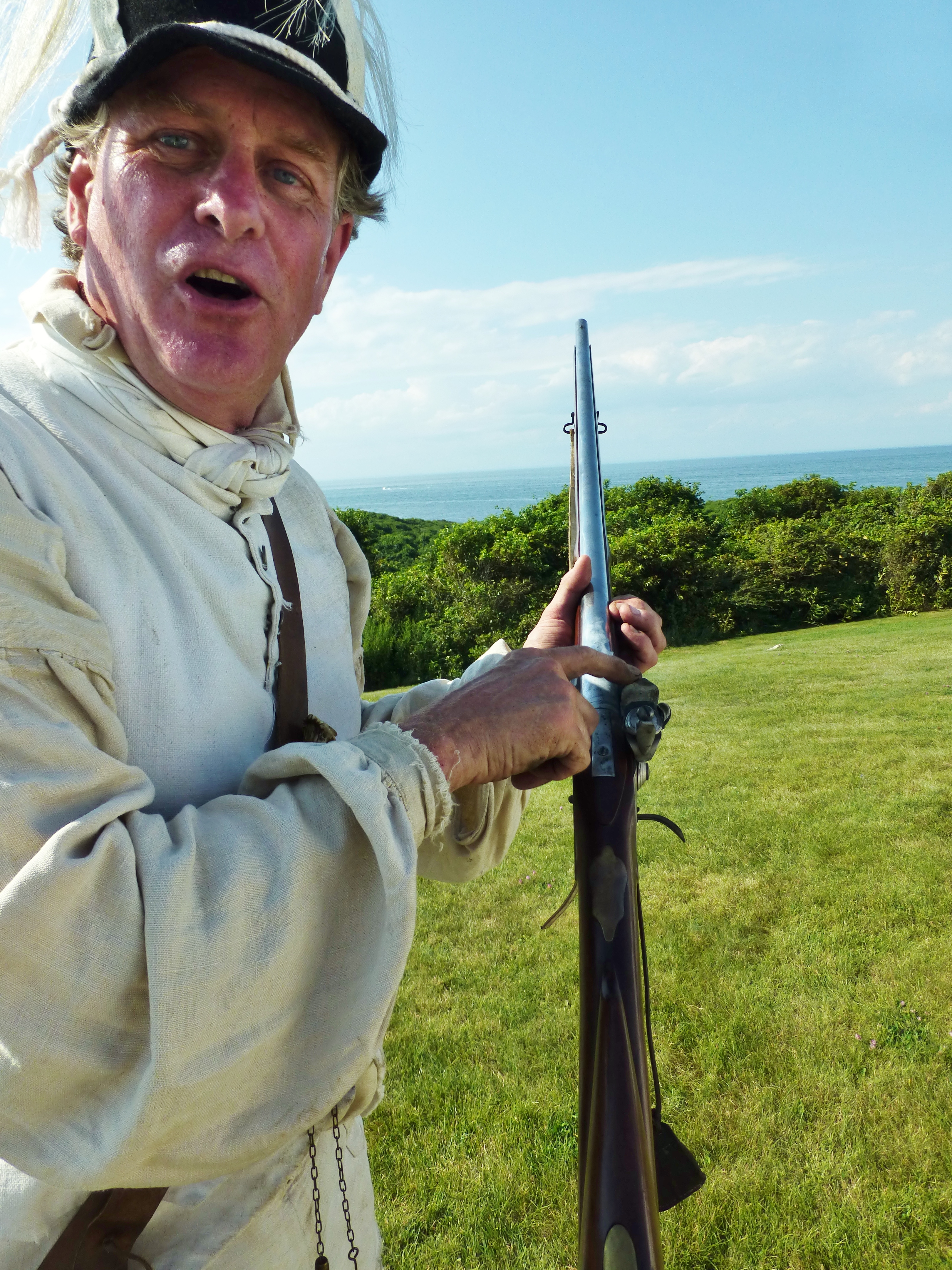 A gentleman in historic garb from the 1700’s, holding a musket, looks out at the craggy shoreline from the Montauk Point Lighthouse.