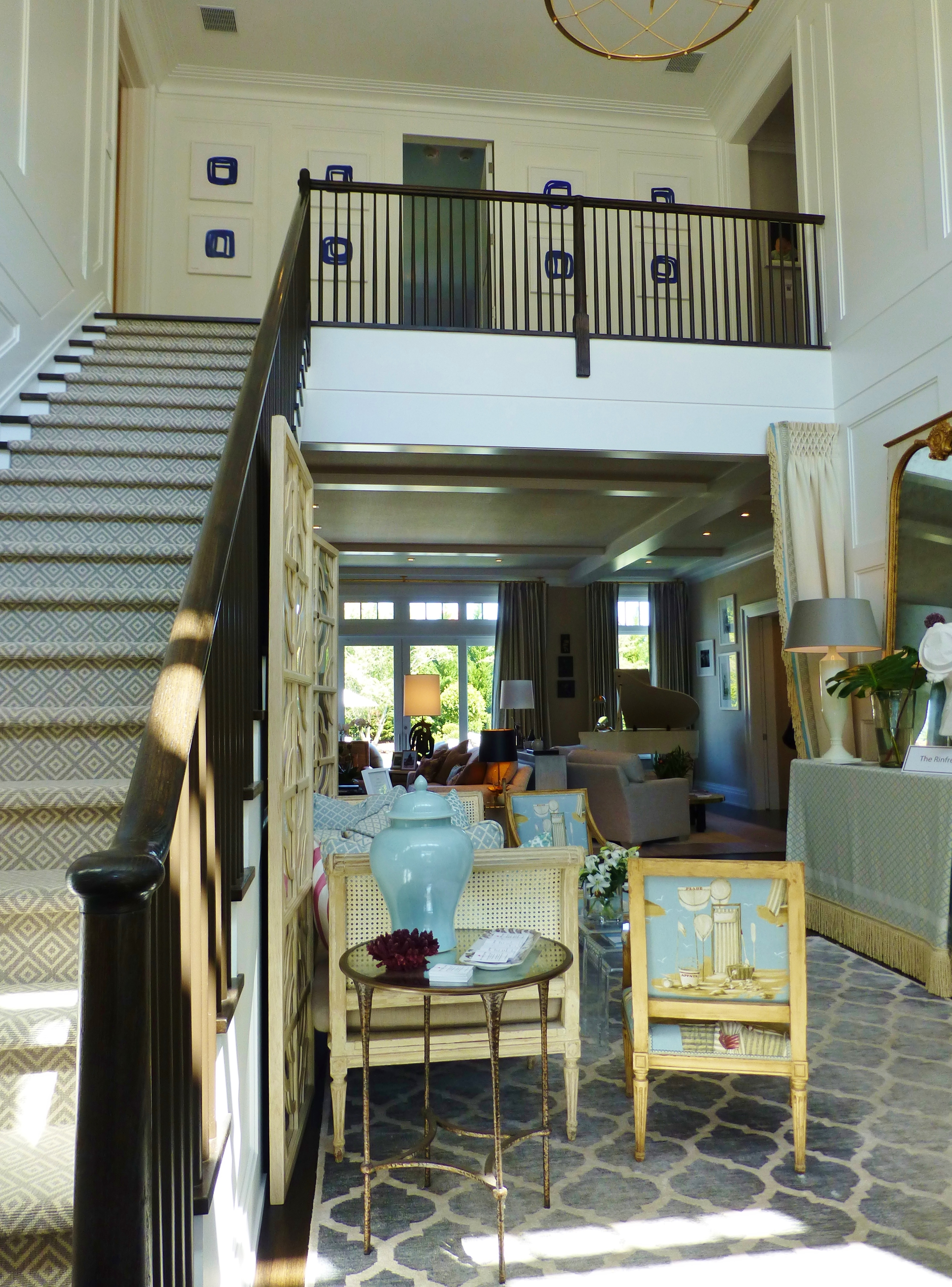 Just inside the front door is a foyer sitting area by The Rinfret Group. The grey and ivory geometric stair runner coordinates beautifully with the large grey trellis area rug below. By the way, the upstairs hallway, which you can see a little in this image, is designed by the Mark Humphrey Gallery.