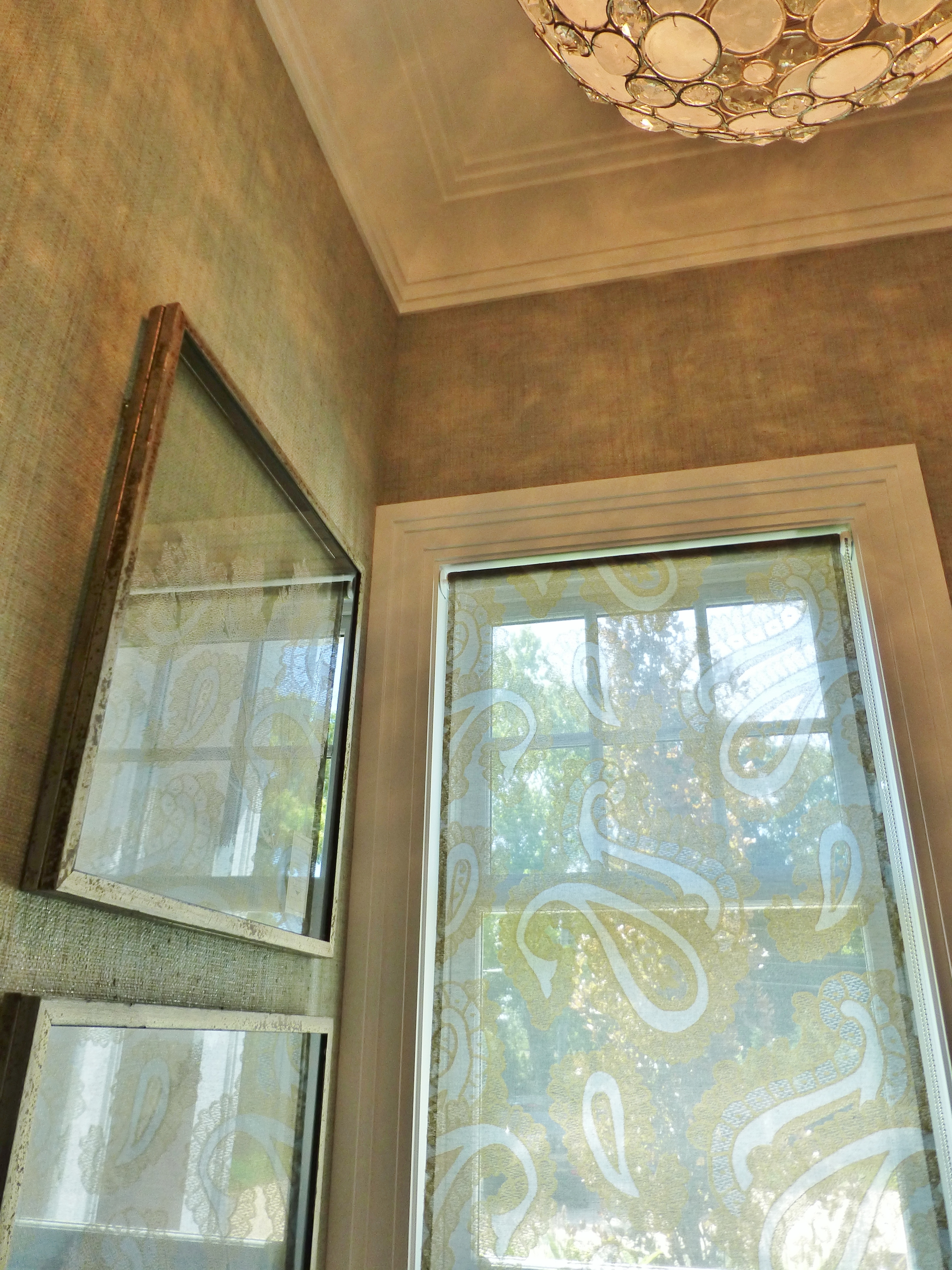 The walls in the powder room were covered in a textural metallic grasscloth. The single window features a truly beautiful roller shade with a metallic paisley sheer fabric. I think roller shades are making a real come-back and they are so practical! This one is stunning.