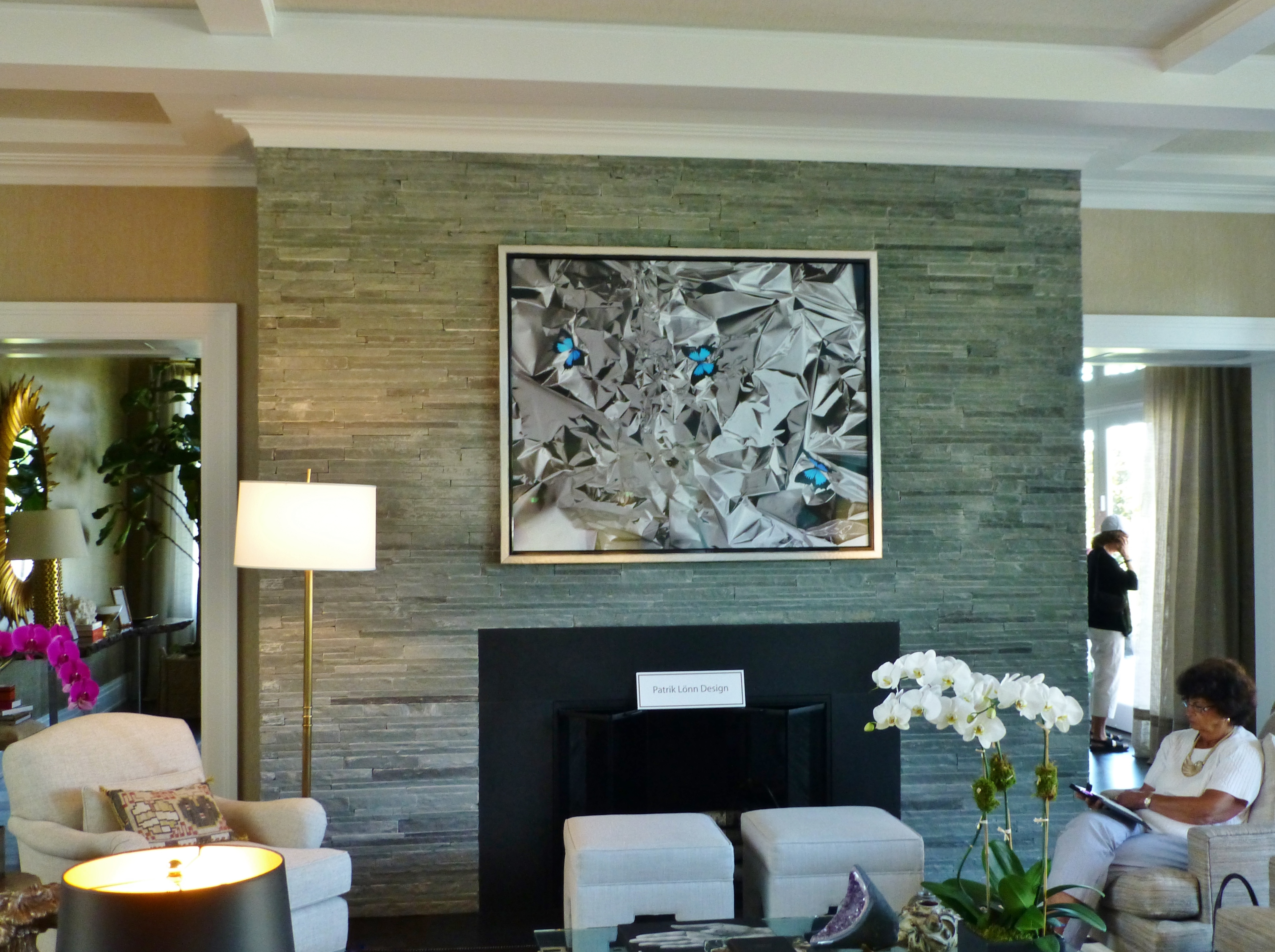 Across the room is the fireplace faced with a grey stacked stone. The contemporary artwork has neon turquoise butterflies scattered through what looks like crumpled tinfoil.