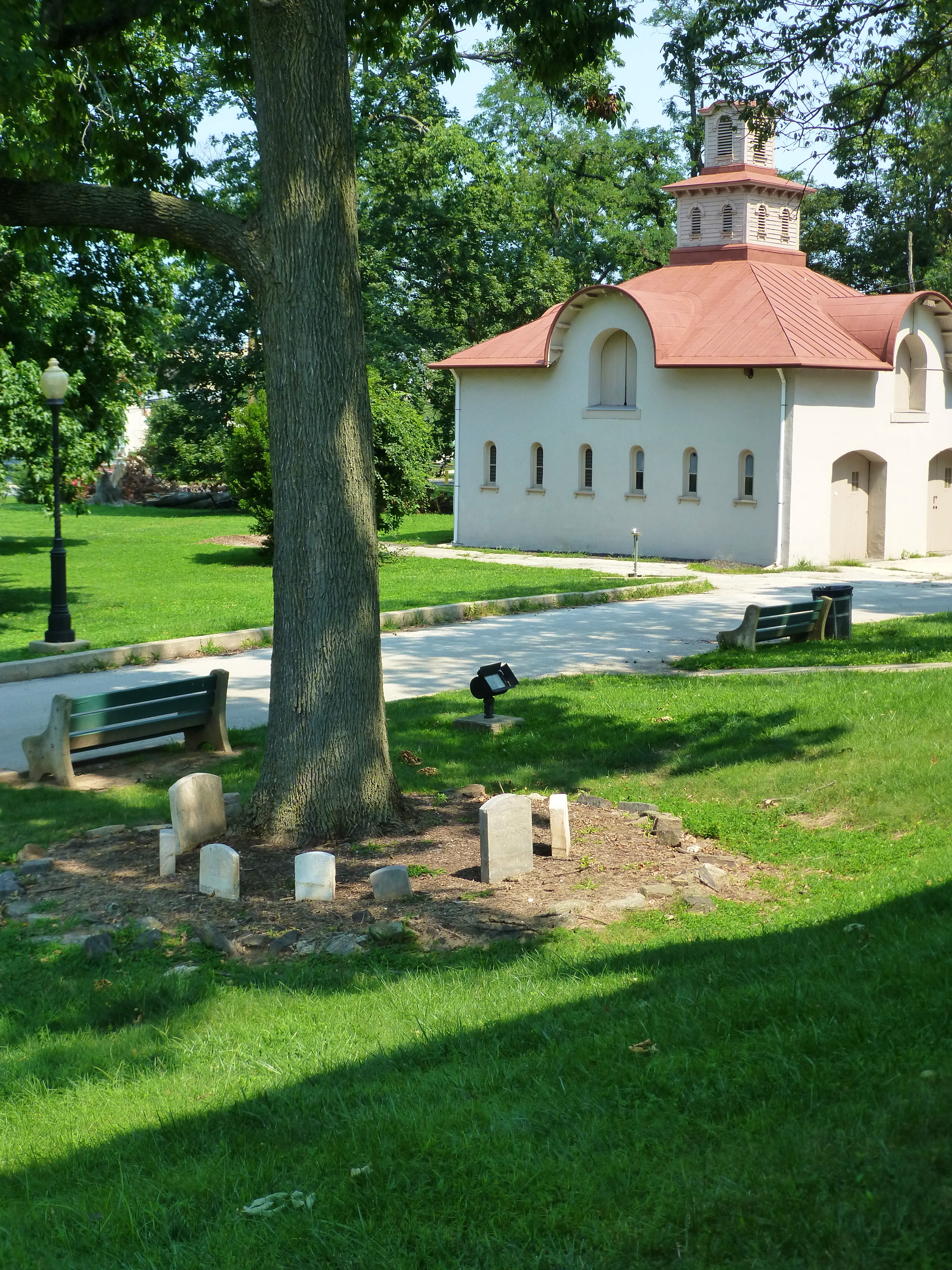 Behind the mansion is a lovely carriage house, which matches Burholme nicely. And here you will notice is the small pet cemetery, sited beneath a nearby tree at the side of the Ryerss Mansion.