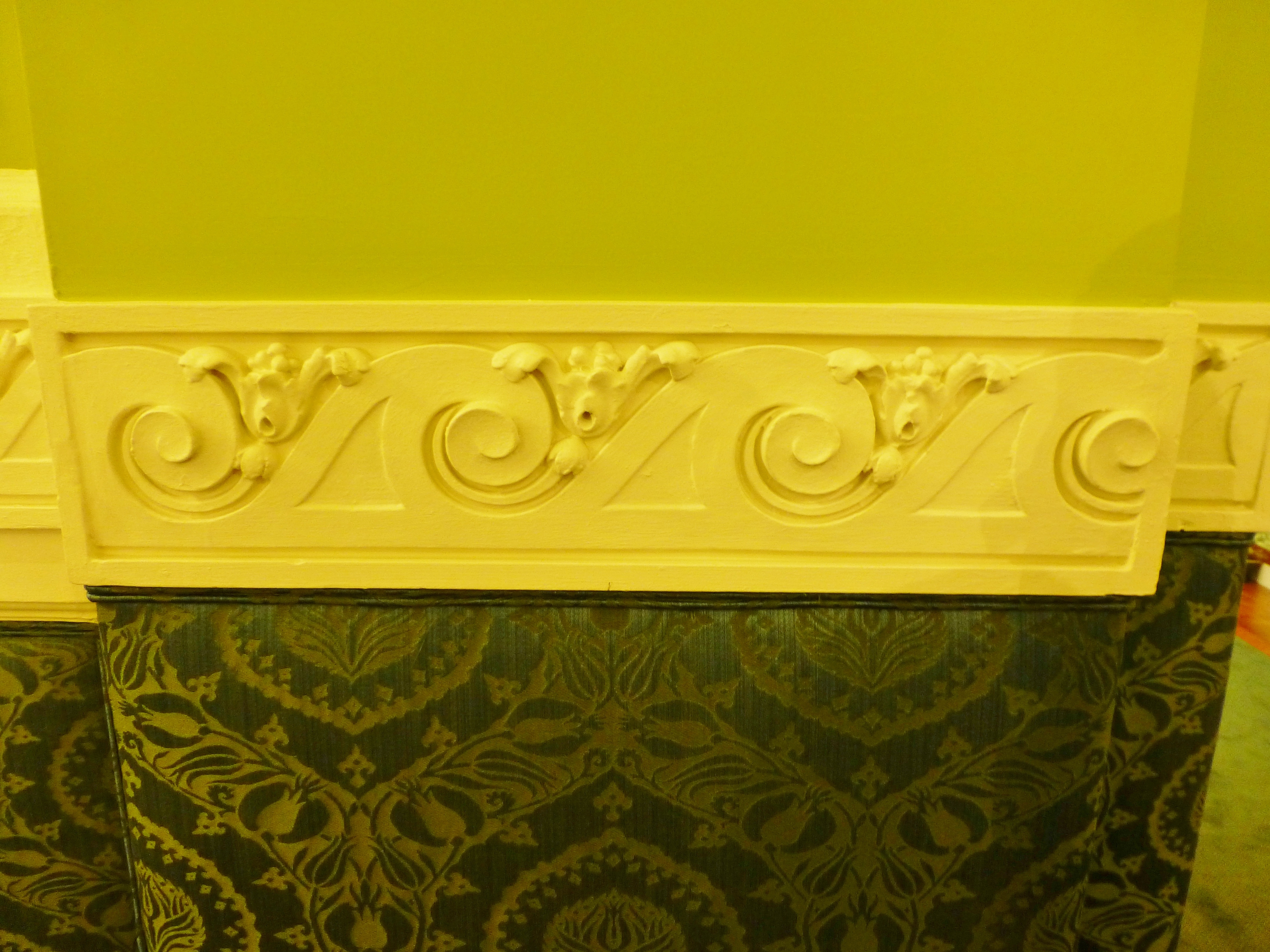 The color scheme chosen by Yarosh is very bold with a strong verdant green above the detailed chair rail with Grecian motifs.