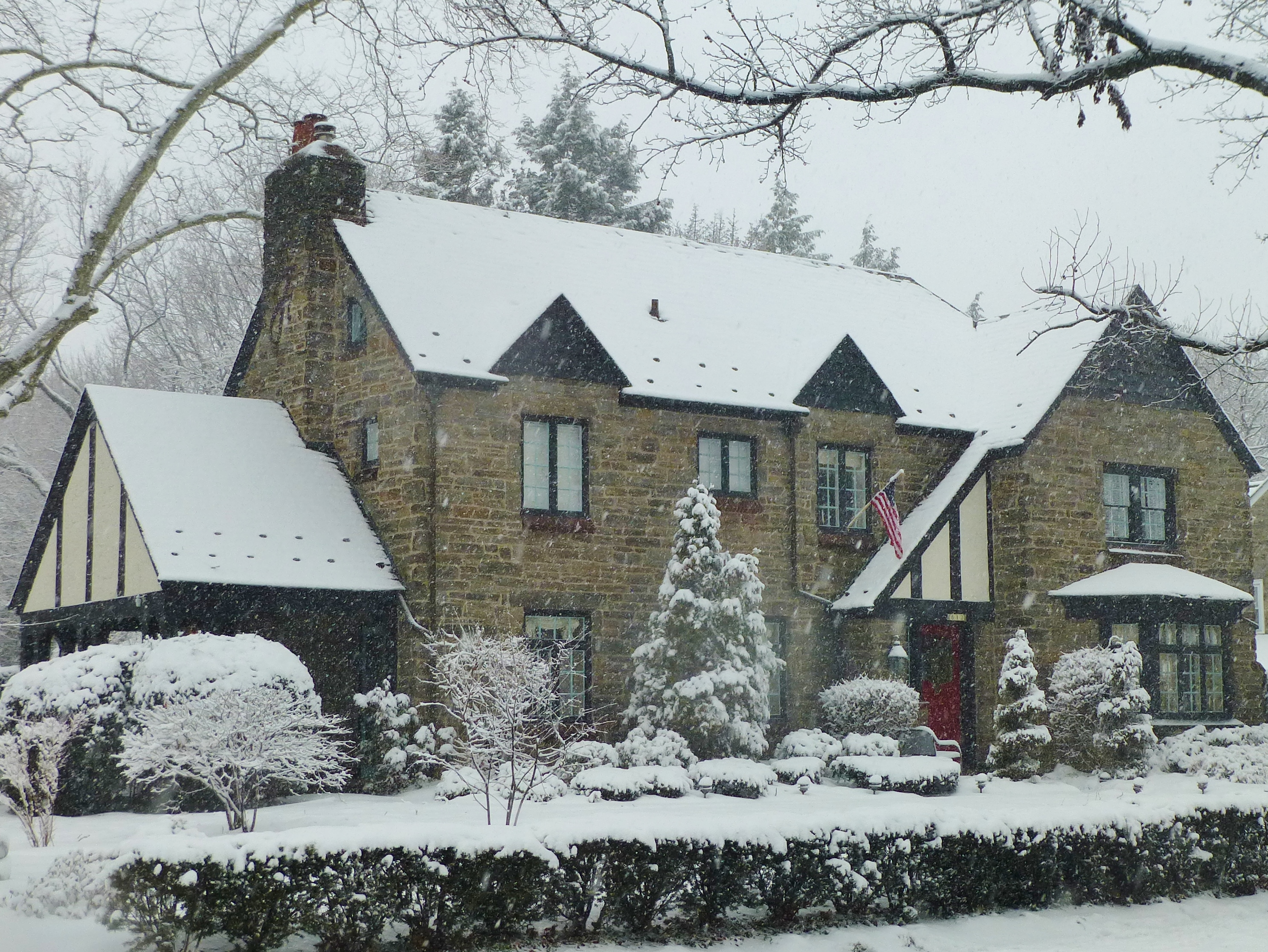 Here’s a large stone home with many Tudor details which are painted dark, almost black. I really like the high contrast here…especially with their red door and all that white snow.