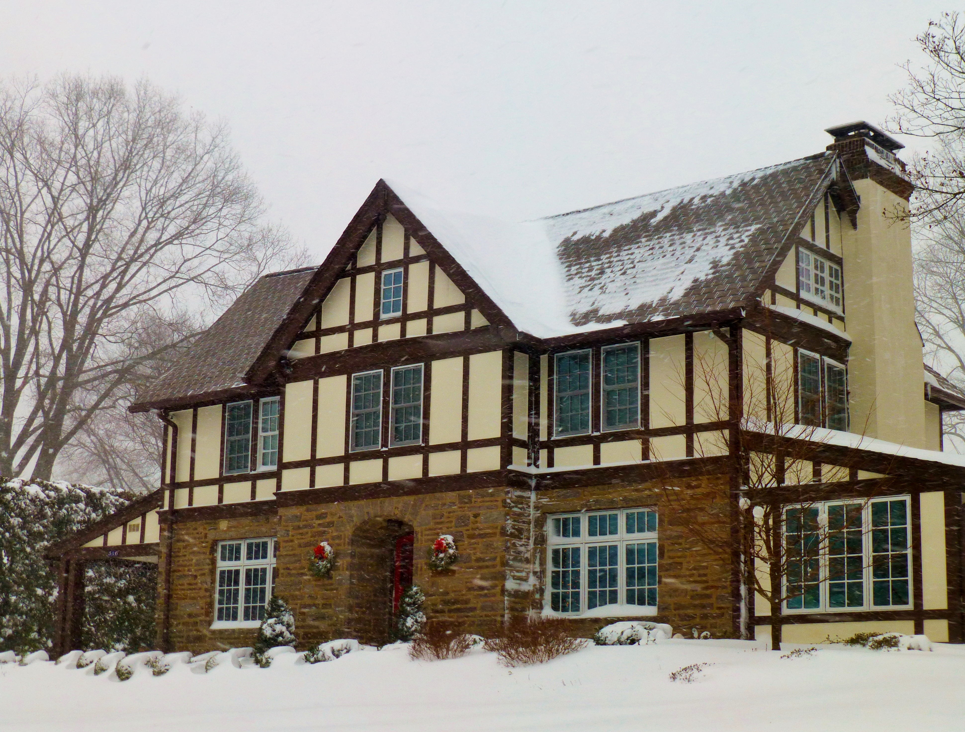 This elegant Tudor could be on a Christmas card with it's lovely wreaths still flanking the arched doorway.