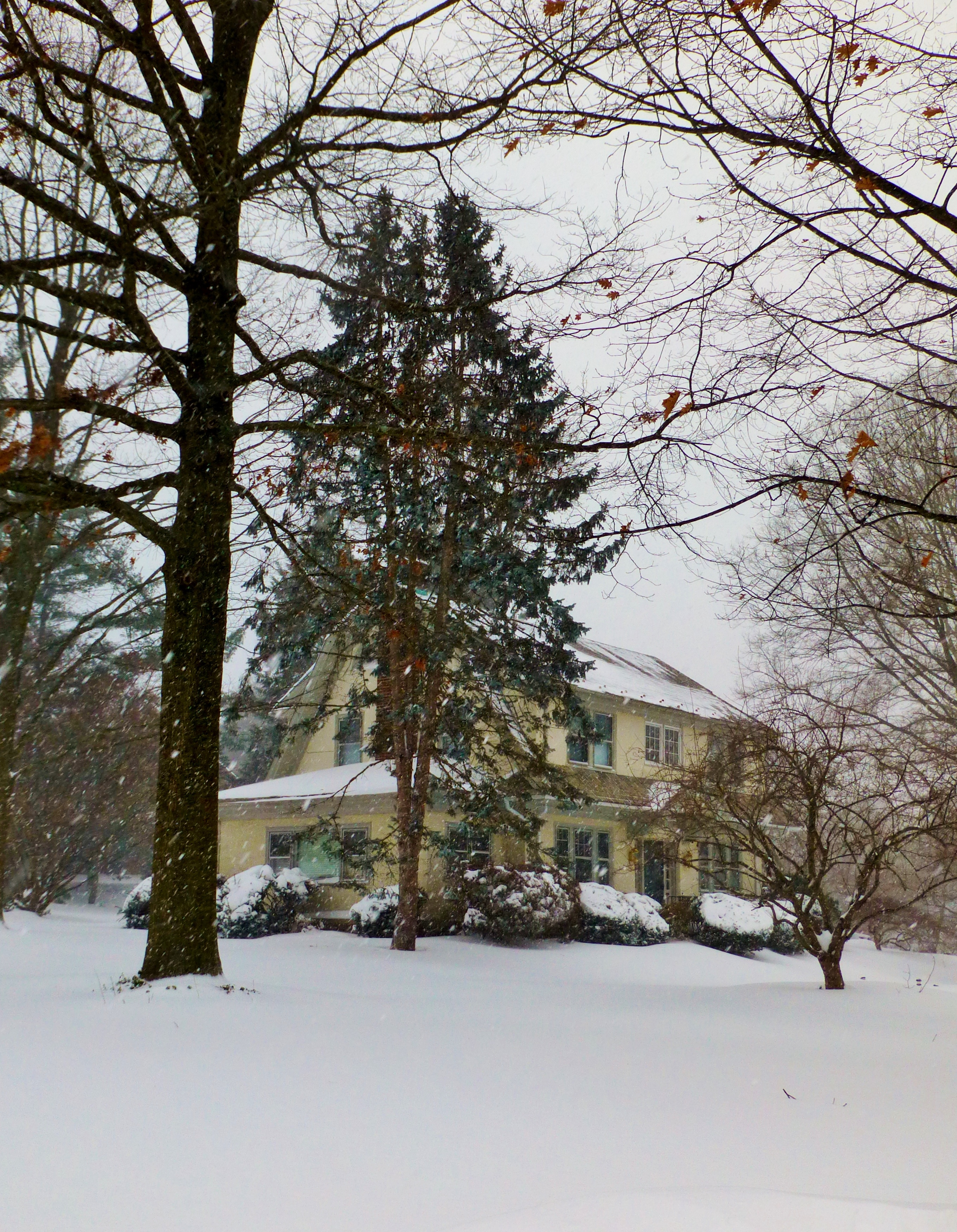 Here’s a butter colored cottage with a gambrel roof. It’s quite charming, all nestled amongst the snow covered trees.