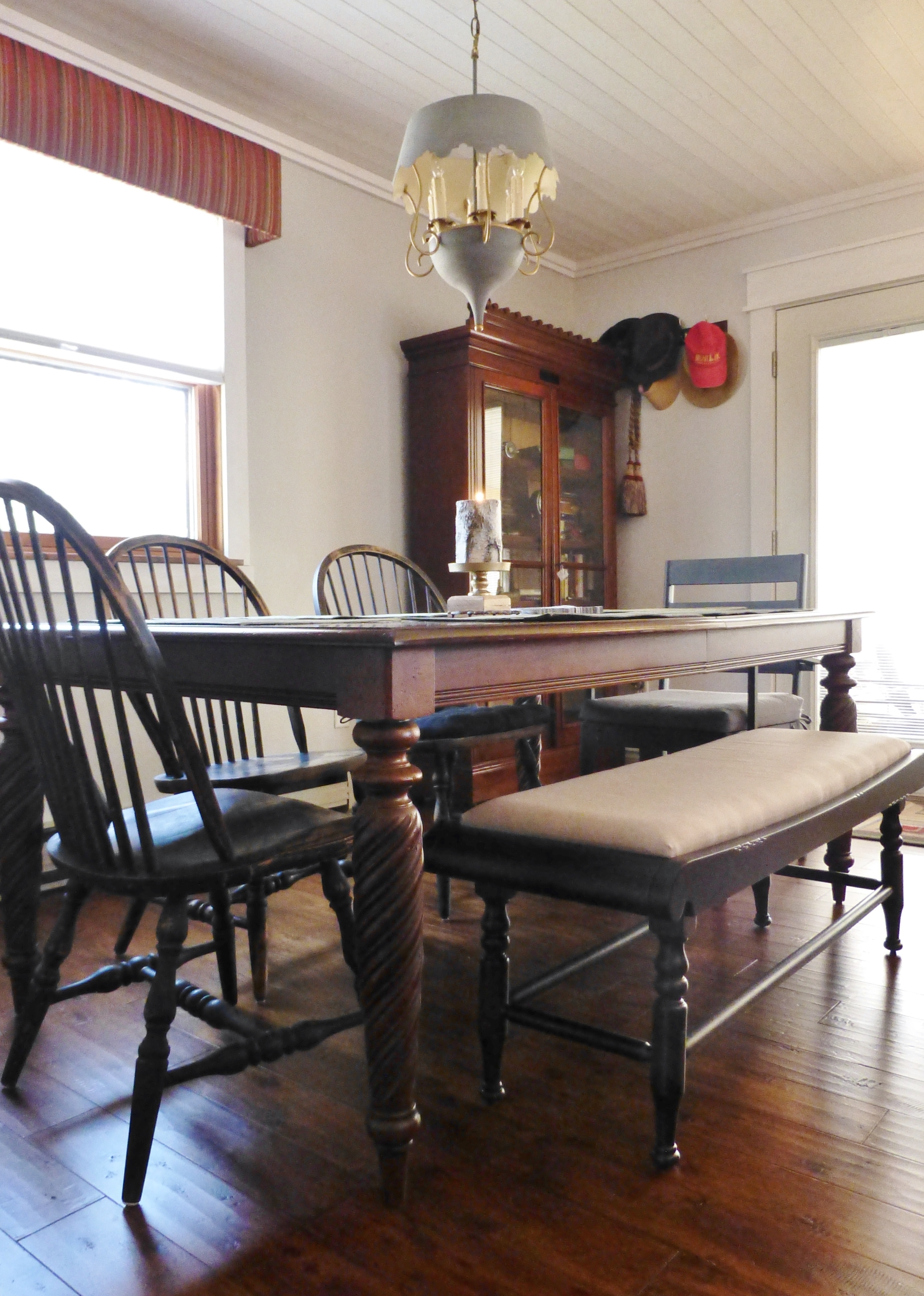 Here’s a photo of my new/old table in the dining area at The Shack. The larger size is perfect for the area and the color of the wood stain is just right with our beautiful hardwood floors!