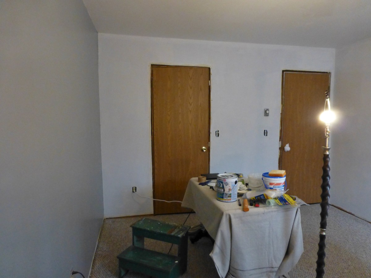 Finally, we are able to prime the walls. I say ‘we’ and of course I mean my dear husband, Eric. First he removed all the door and window casings and baseboards. Then he patched any holes and nail-pops in the drywall. And finally, he was able to prime the ceilings and all four walls.