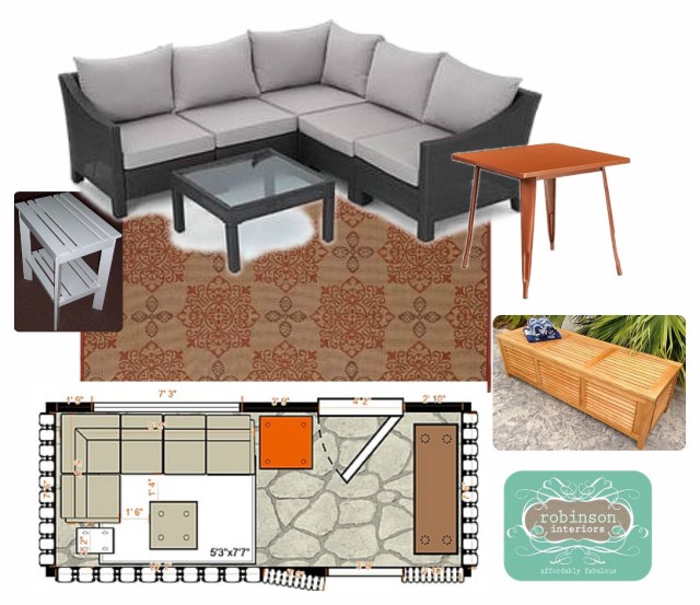 We also tweaked our floor plan a bit: Now we’re using only one of the large copper finished tables in the corner as an anchor piece. It’ll be great for placing potted plants and I’d like to hang a pendant lantern above it in the corner for much needed light at nighttime. A colorful pouf ottoman can also be tucked underneath for use when relaxing on the sofa or chairs. The client also let me know about a long, narrow primitive bench she already had that might work well as a coffee table of sorts while still fitting in with the cottagey style we’re trying to achieve. It’s always awesome to repurpose something you already own, so we’re planning to paint the bench to match the grey neutrals in the new furniture.